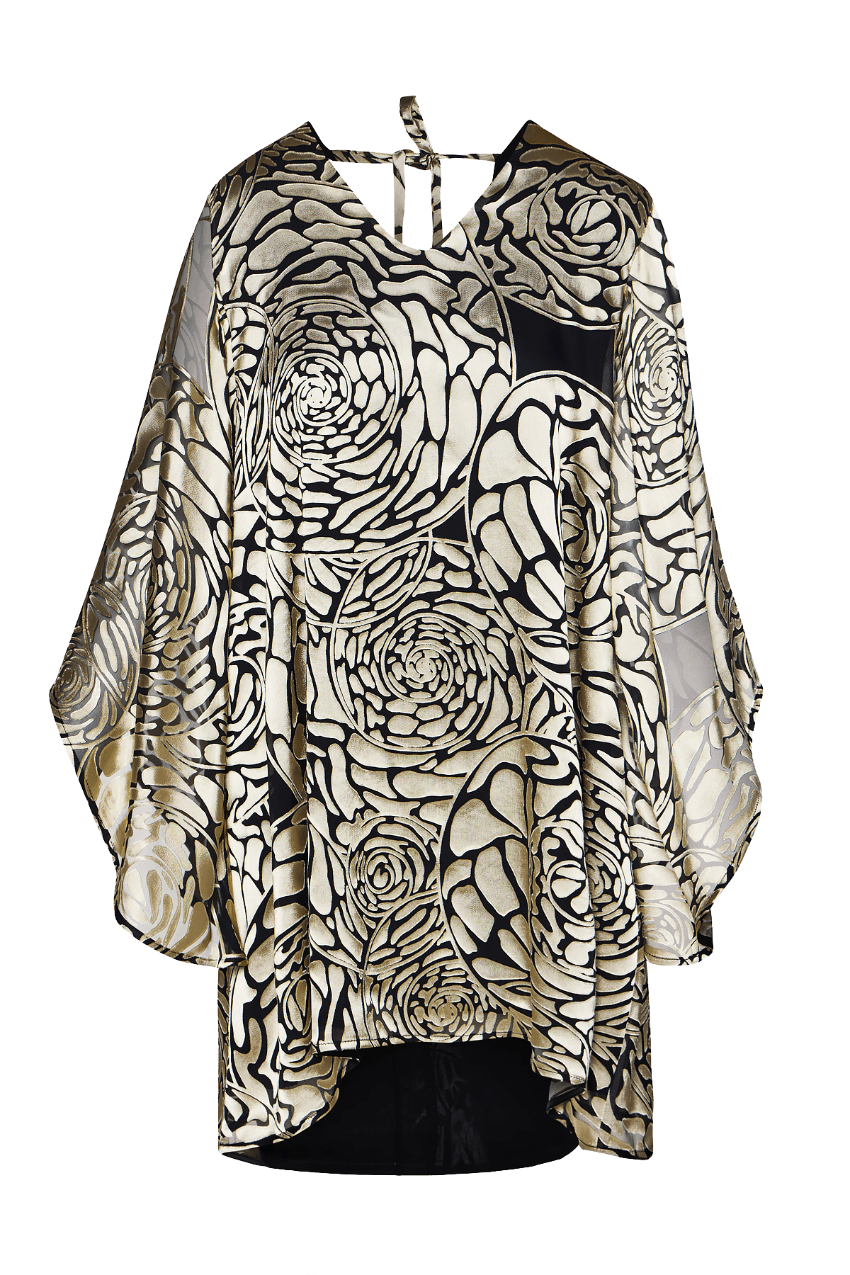 The perfect mini dress addition to your hot summer days. Crafted from a custom made Kose burn-out silk/viscose textile, best known as devoree, depicting pre-historic Nautilous. The dress features both front and back V-neck and belled-sleeves. Partially lined.