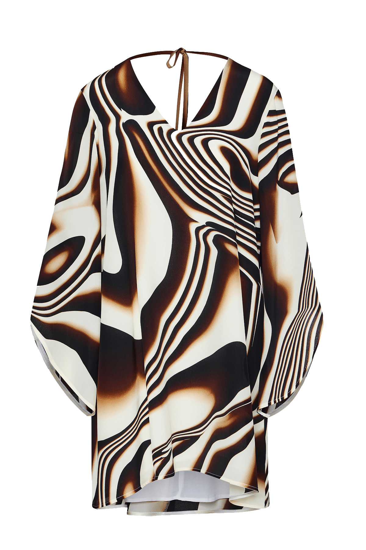 The Athena mini dress, a best seller so far, has returned this Summer in fluid, sensual prints. Here in our Dunes print. Crafted from silk Crepe De Chine, the dress features both front and back V-neck and belled sleeves.