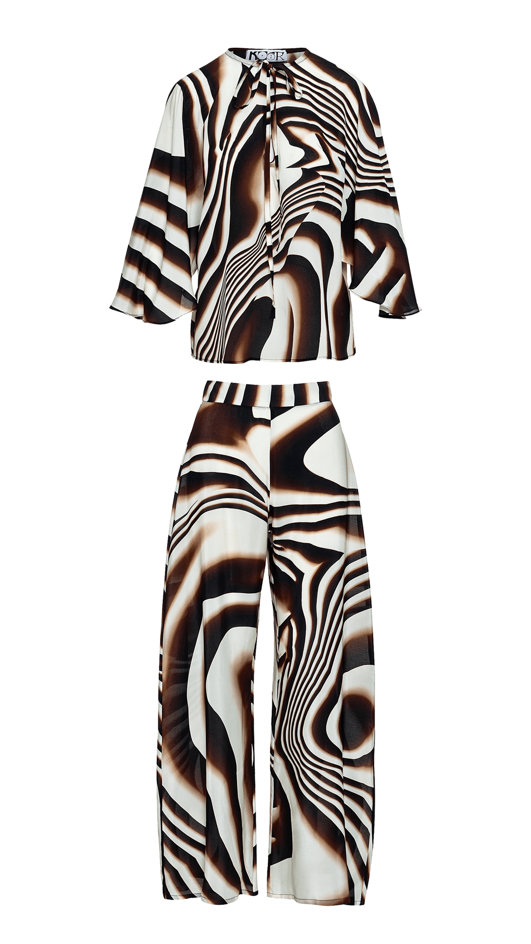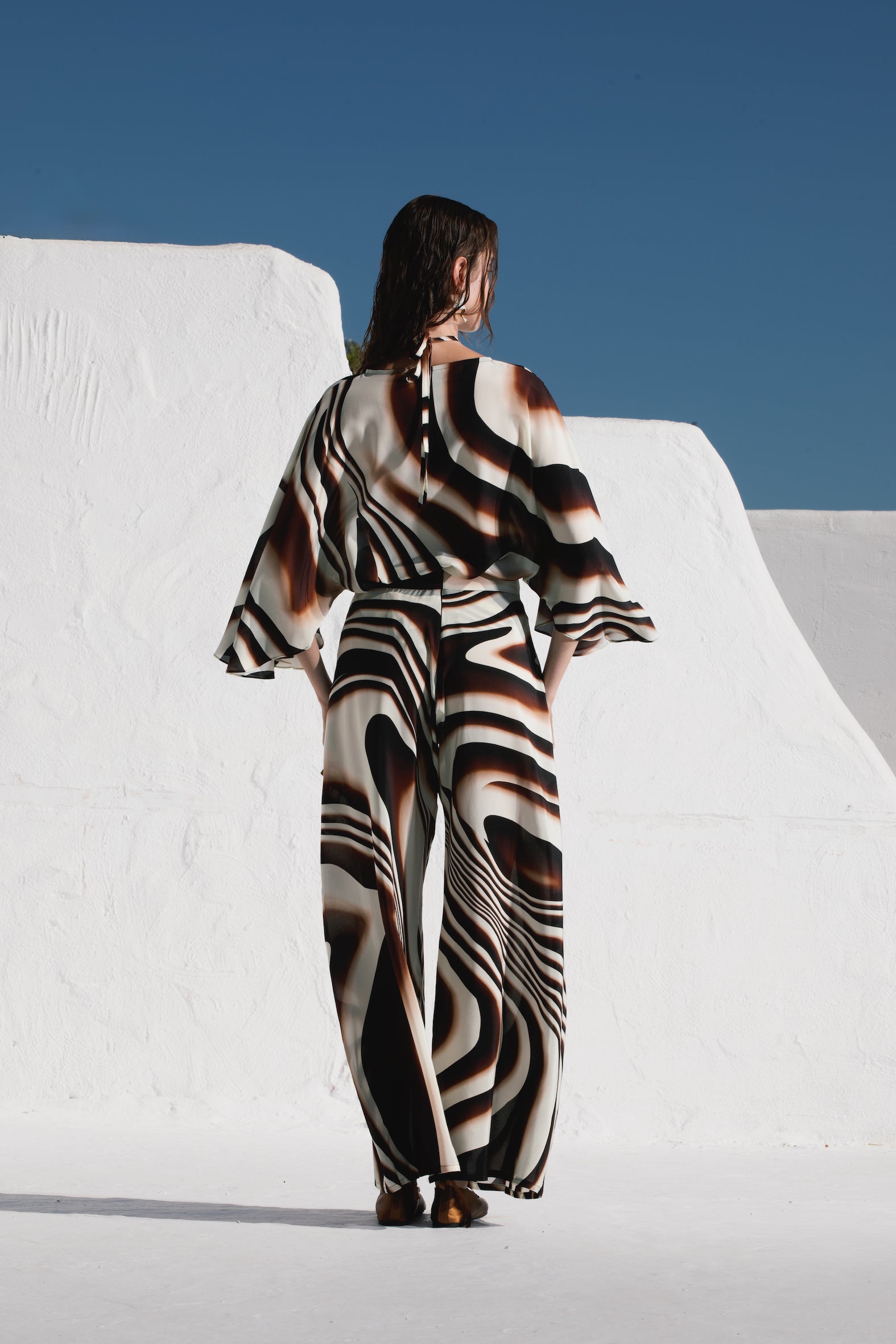 Our sensual liquid lines of our Dunes print adorn this set. Crafted from a soft butter-feel silk crepe de chine, it is the absolute pinnacle of resort looks. The set consists of our Athinais top and our Elli trousers.