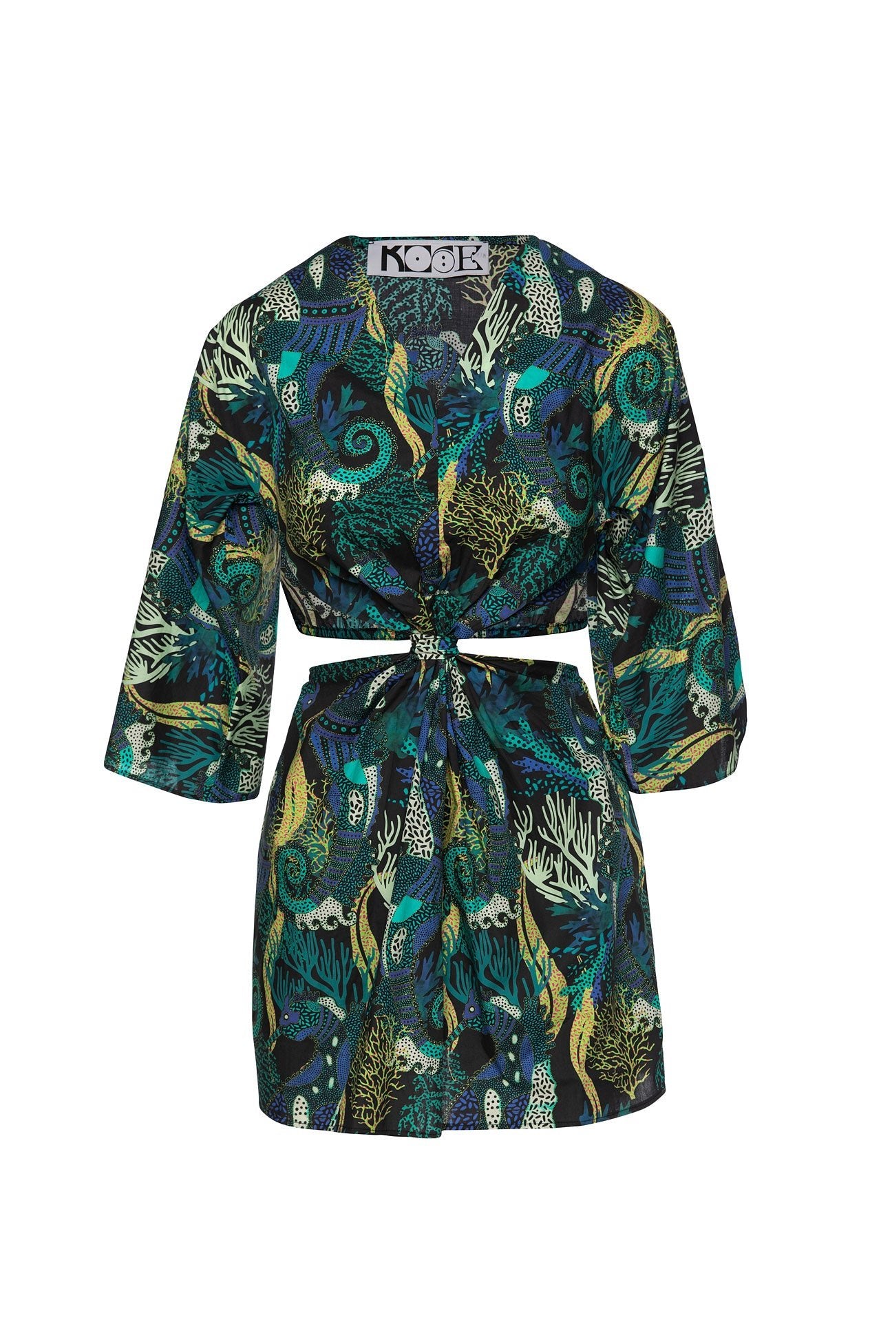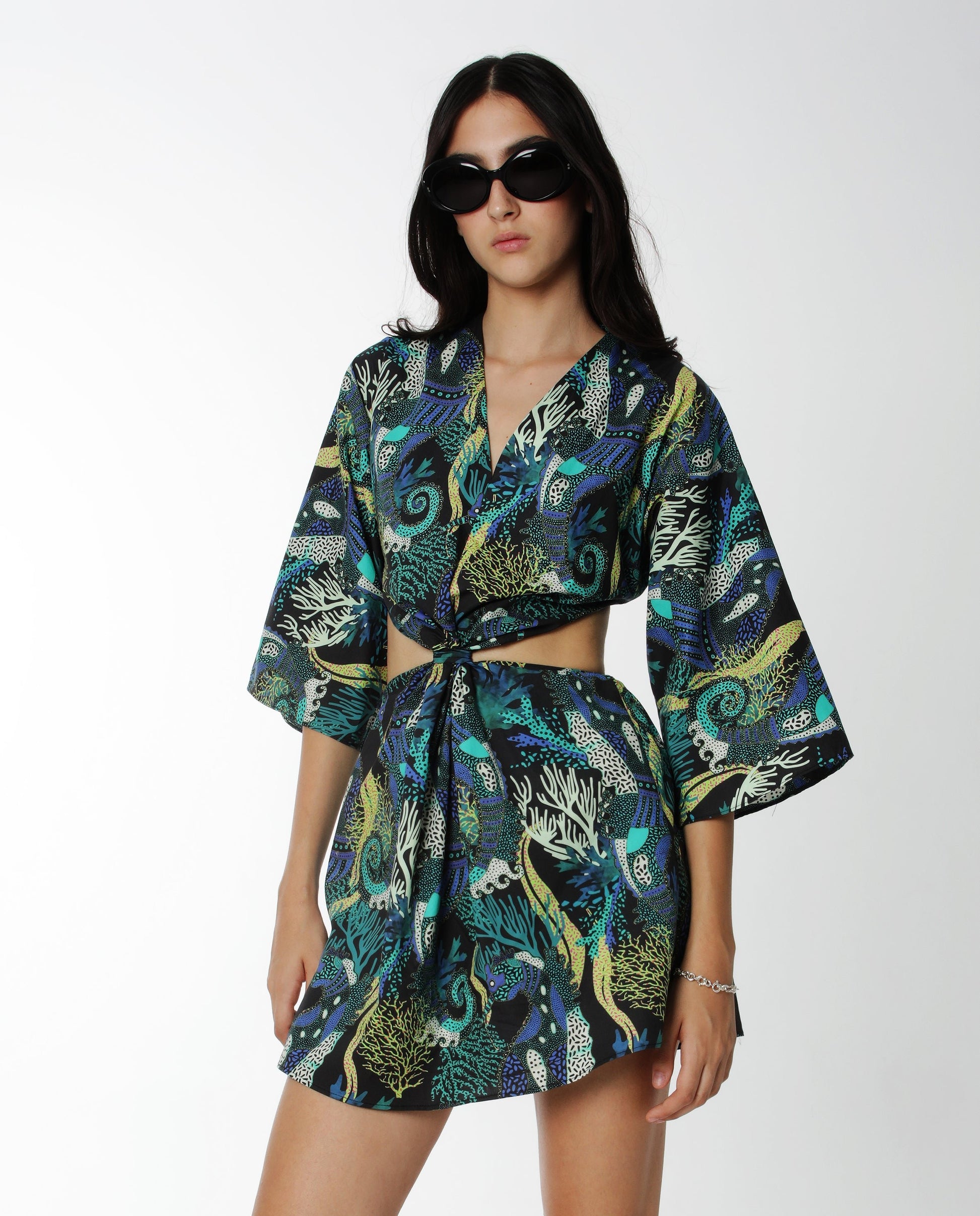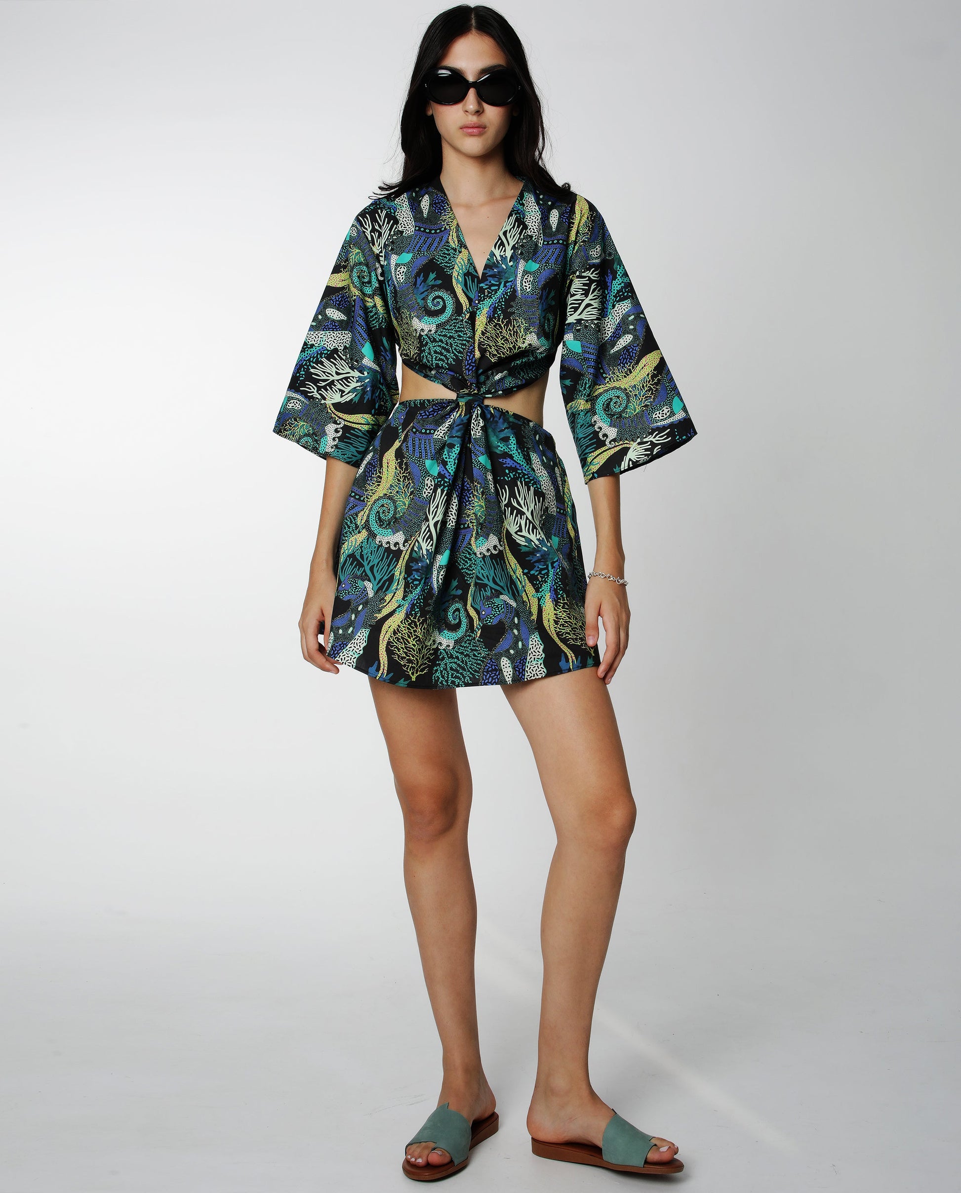 Mini dress with kimono sleeves and slit draped waist. Elastic closure at back and skirt.