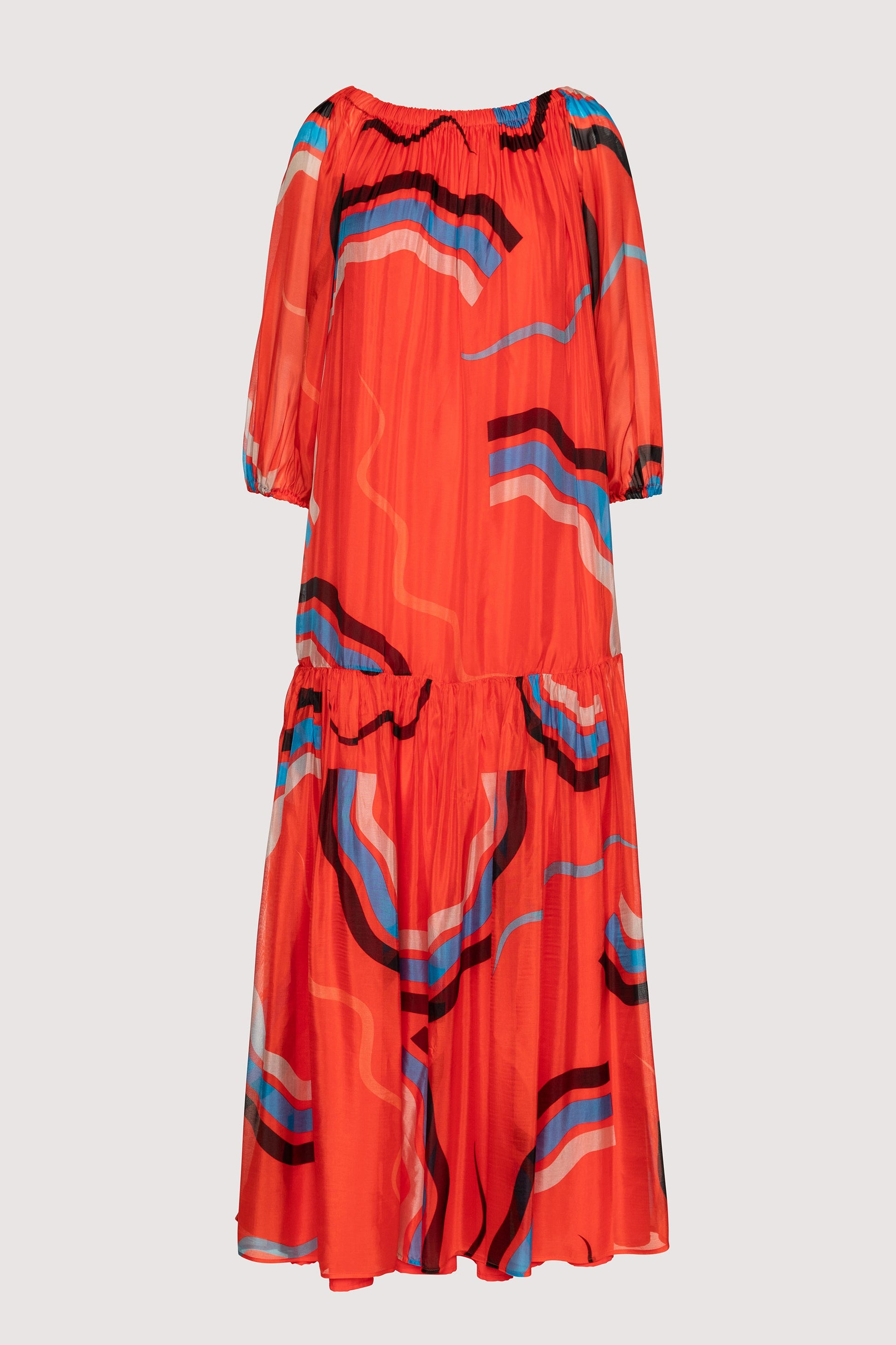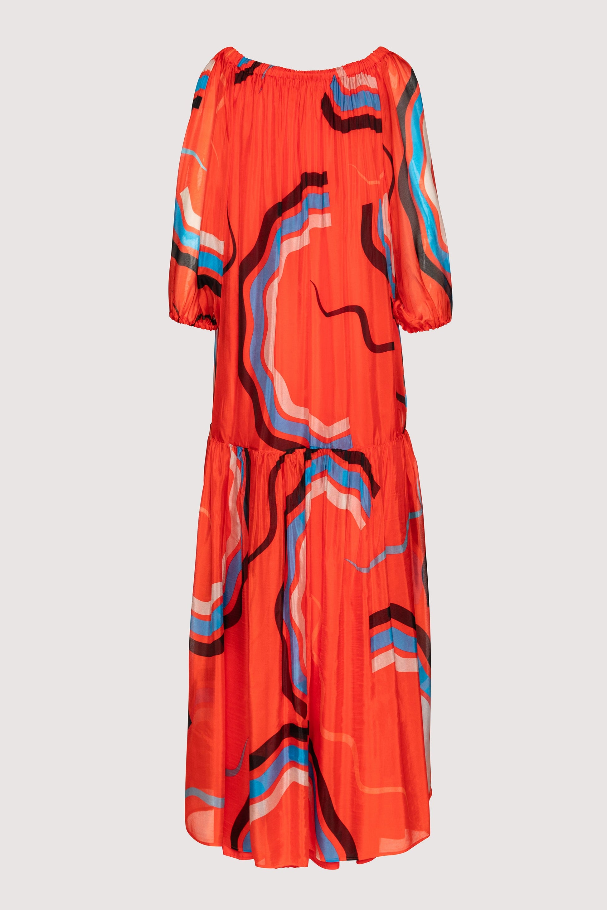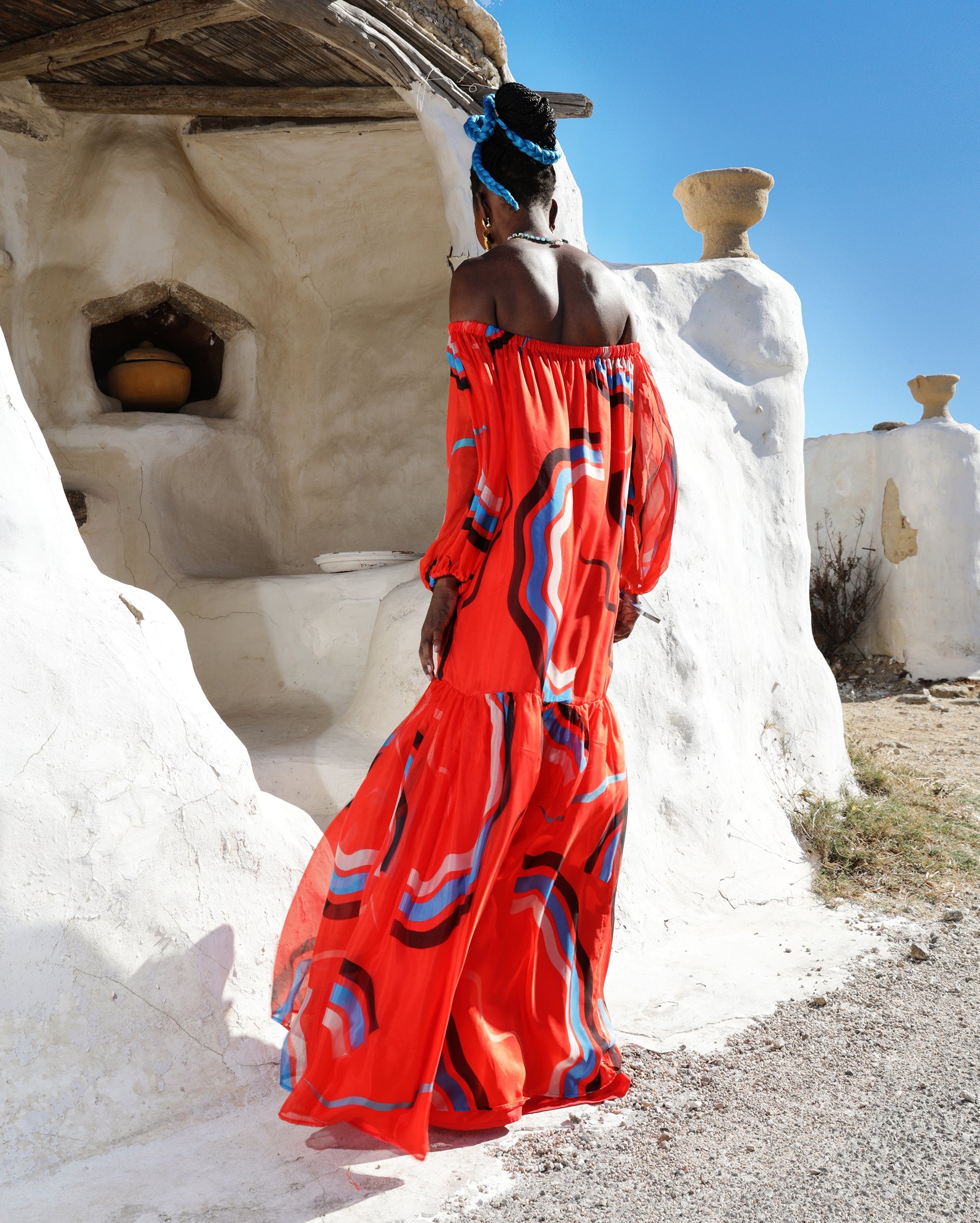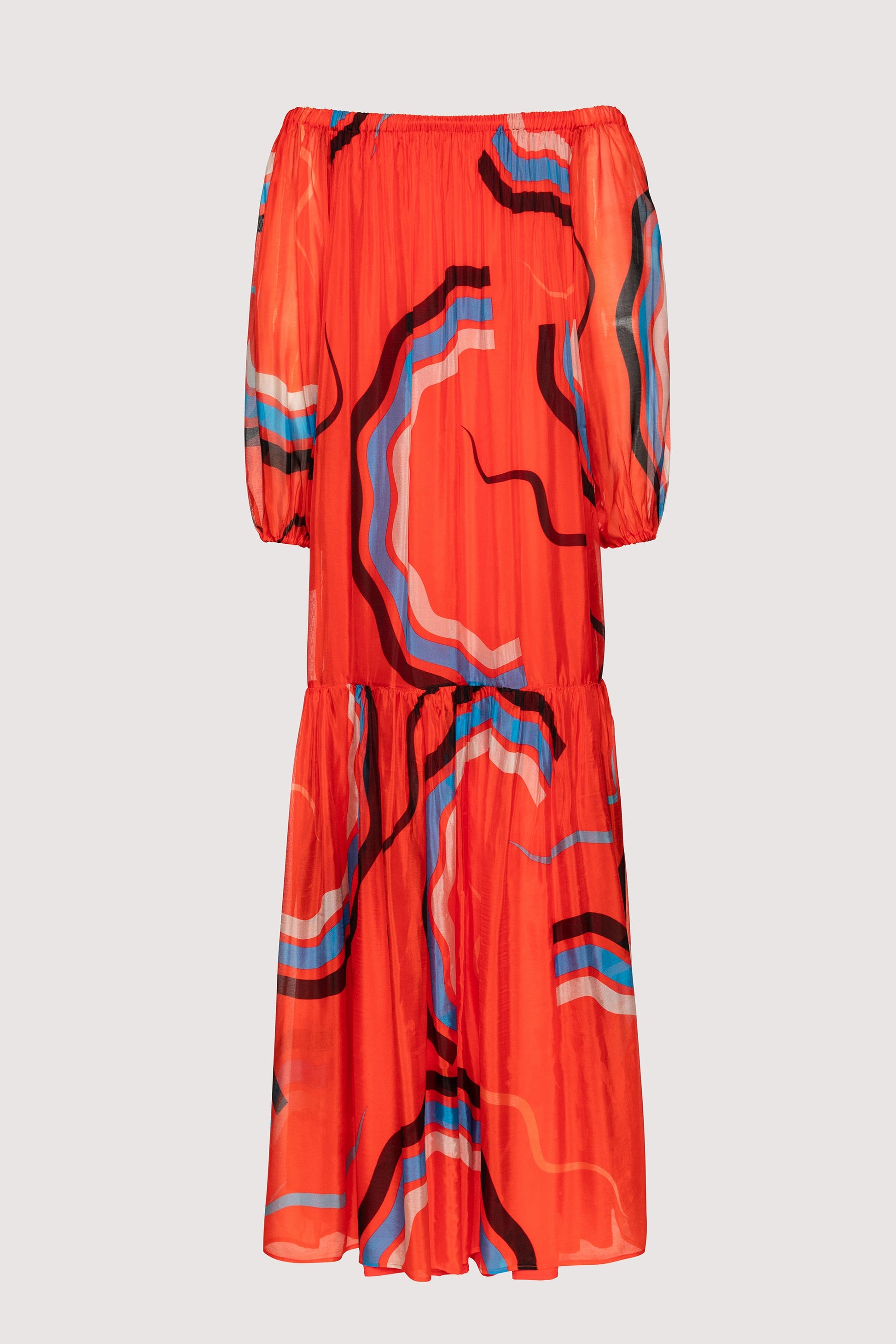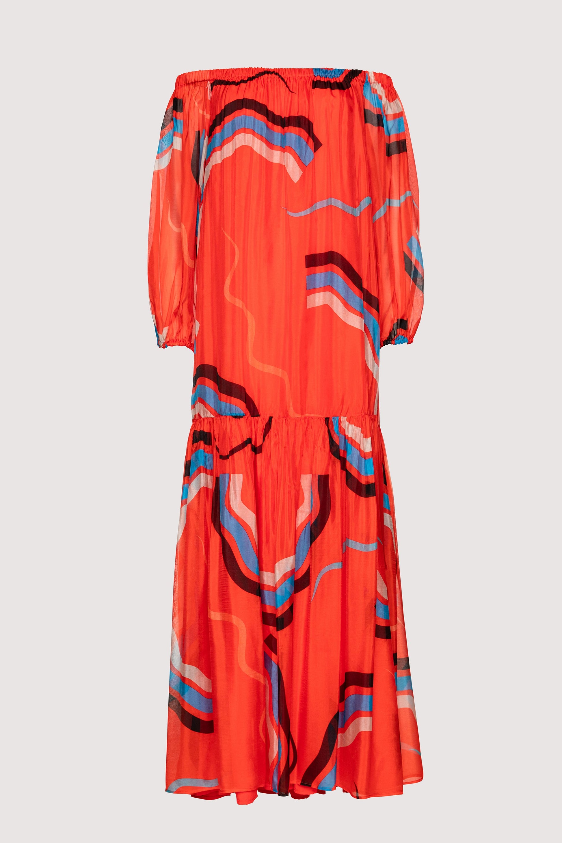 Off shoulder maxi length tiered dress with gathered sleeves. Fully lined, elastic on shoulder and sleeves.