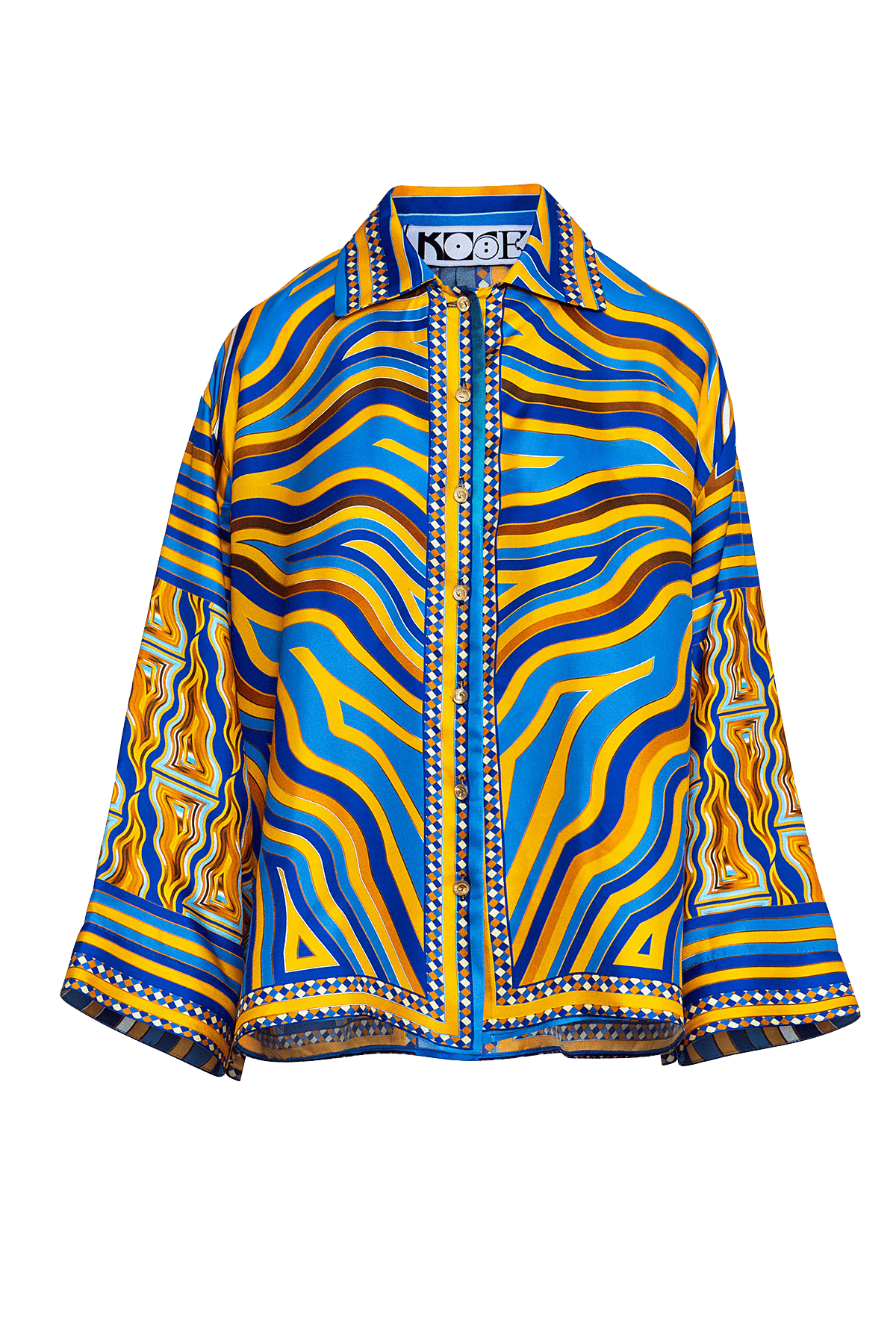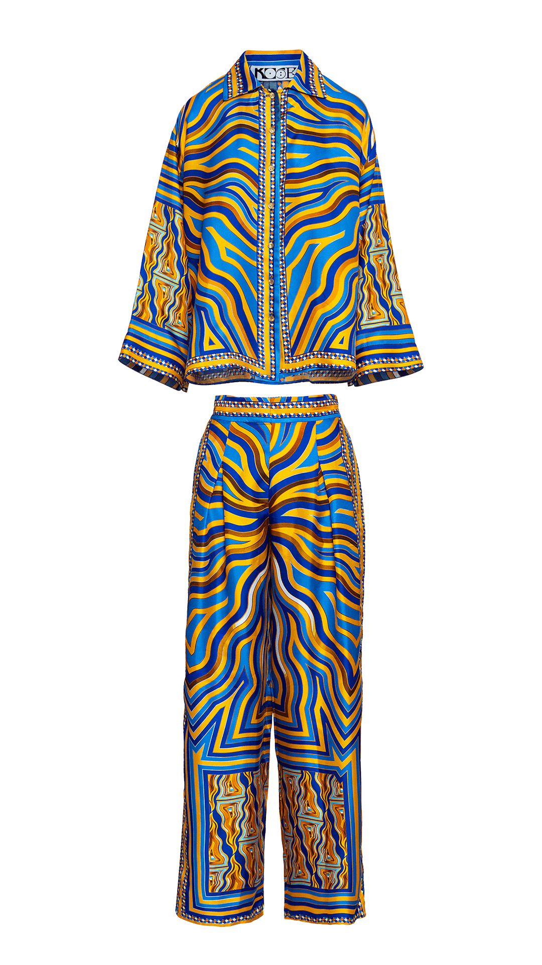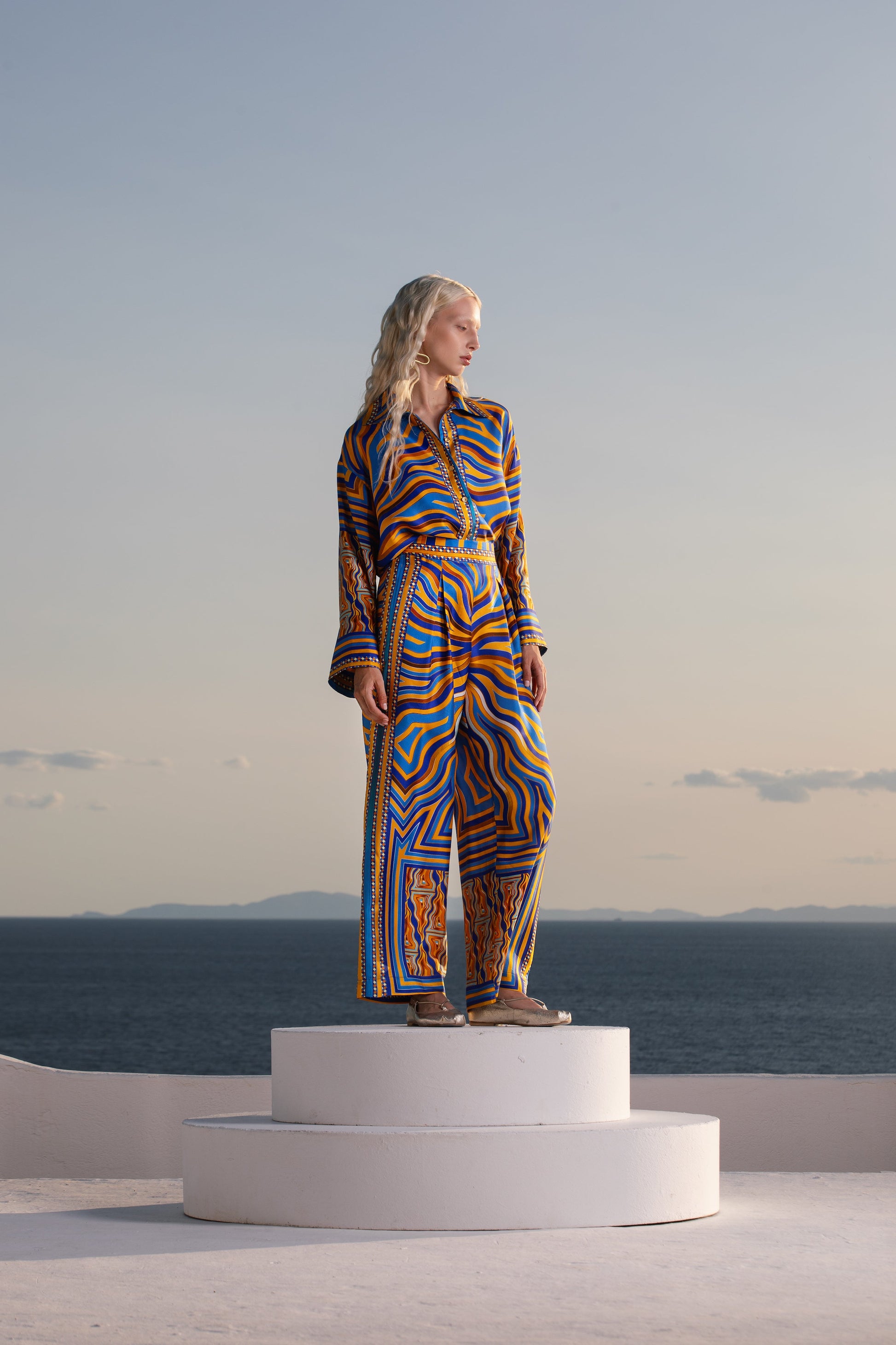 If you want to wonder around with the absolute style and vibrant energy, then our Helios set is your go to dressing. Crafted from silk twill, the set includes the mens' cut Thea shirt and the Odaliska trousers with elastic back detail for extra comfort.