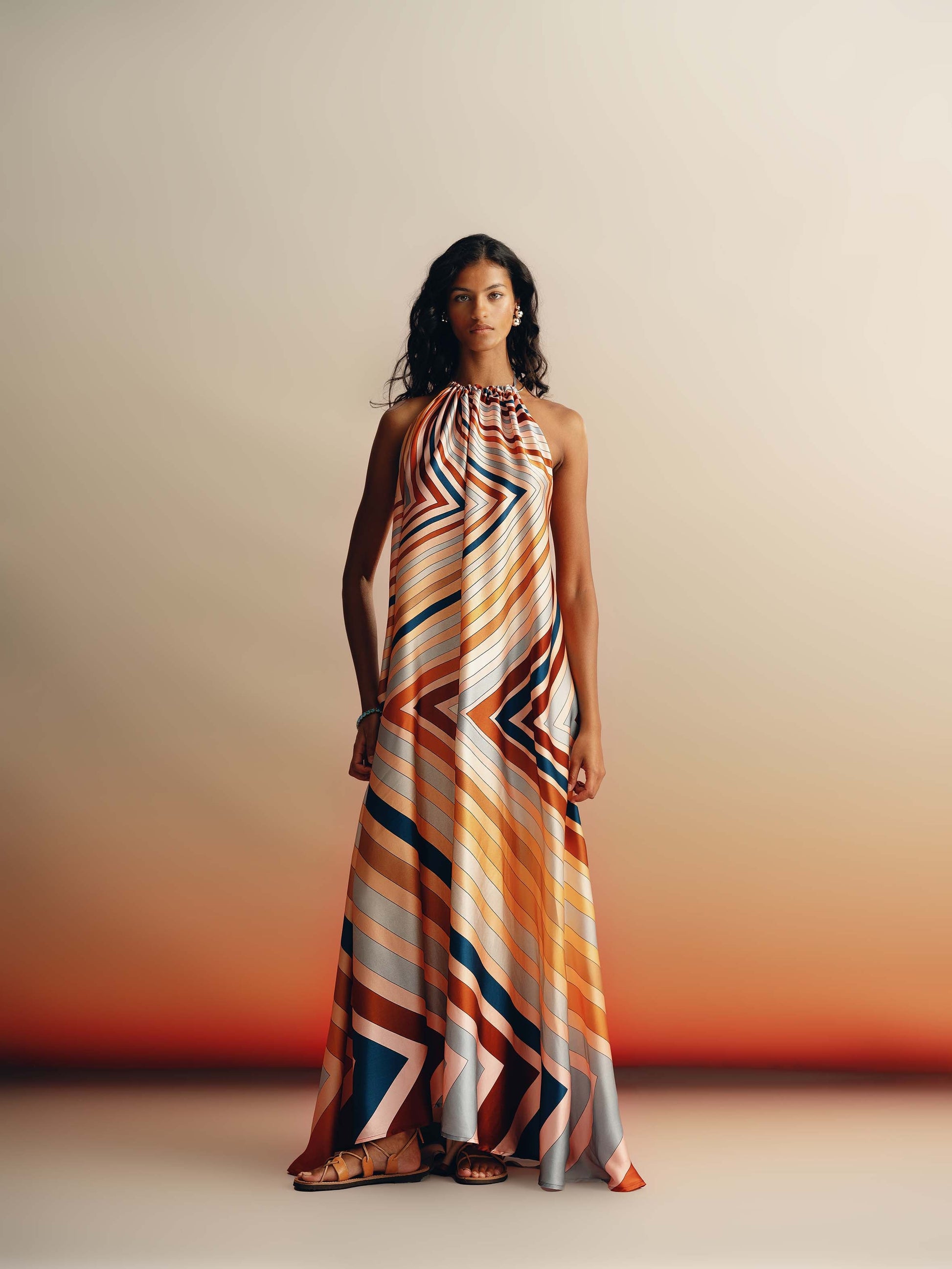 Our Jeniffer Maxi Halter-neck dress comes back this Summer in an updated shape, that gives extra volume and movement. Excellent for day to night occasions, it is the absolute Summer Resort dress. Tie neck closure with fringed tassel, elastic band waist detail on the back.