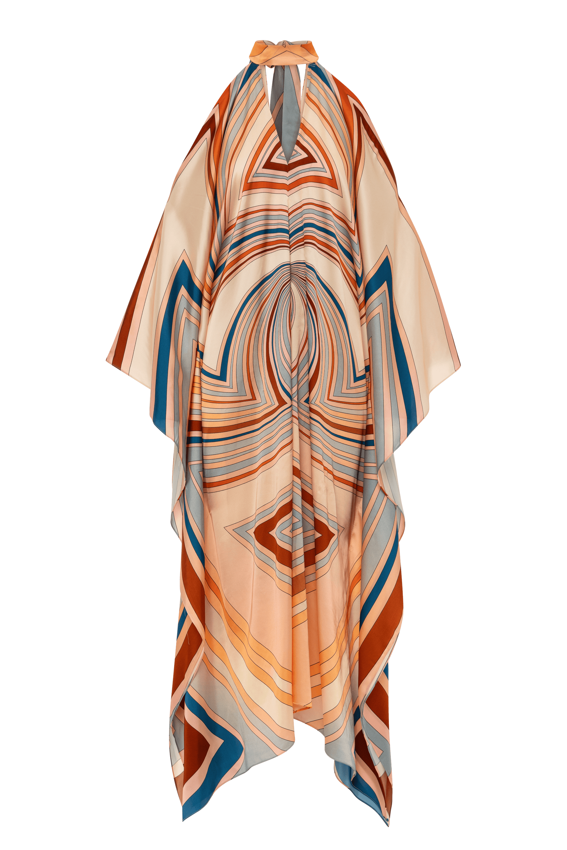 Cold shoulder maxi kaftan with neck tie. The vibrance of the Rainbow Wheel print give an ethereal feeling to the shape of this kaftan.