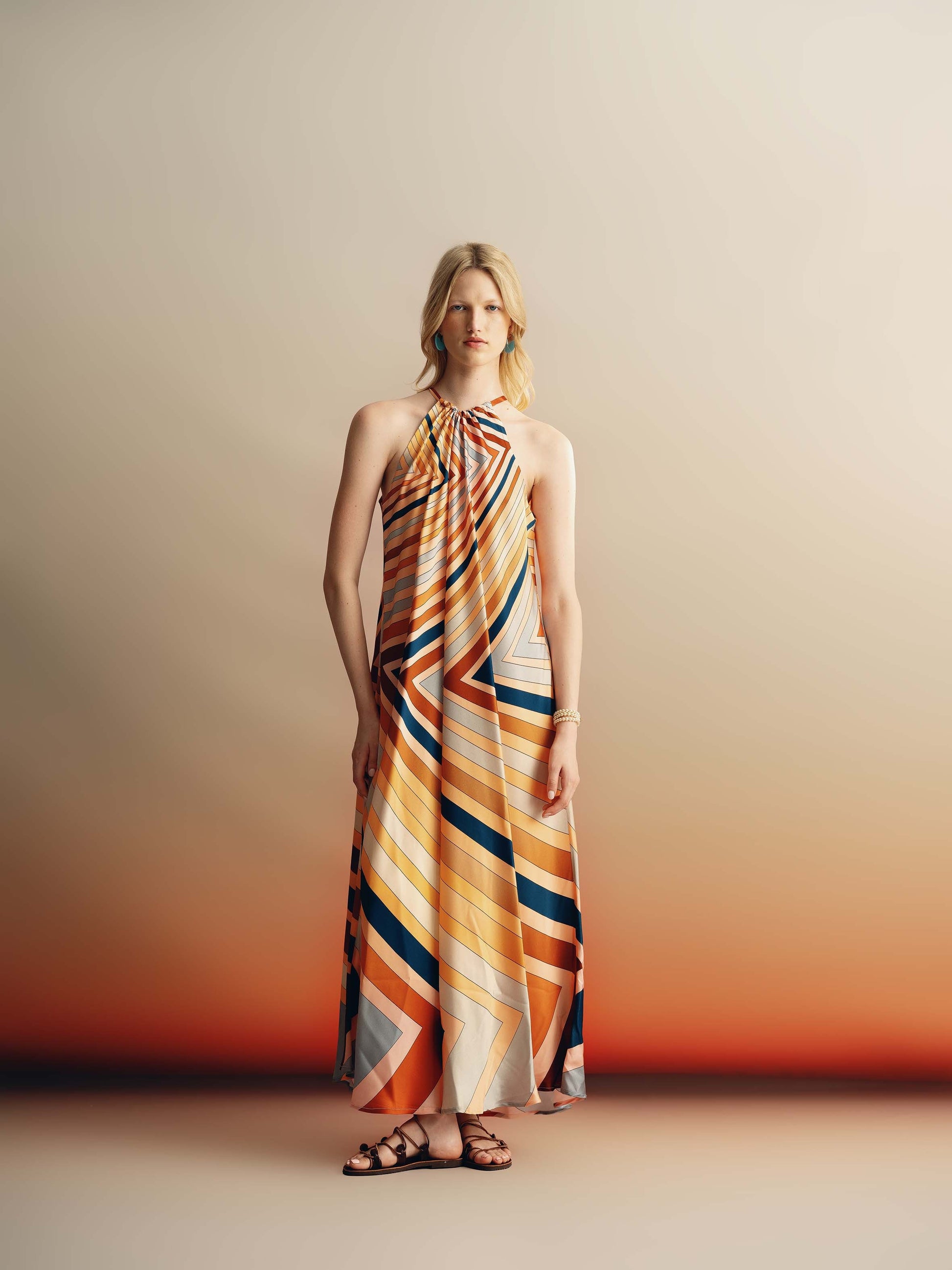 Maxi Halter neck dress cut on the bias, giving a more fluid shape. Cut in our Ranbow wheel print.