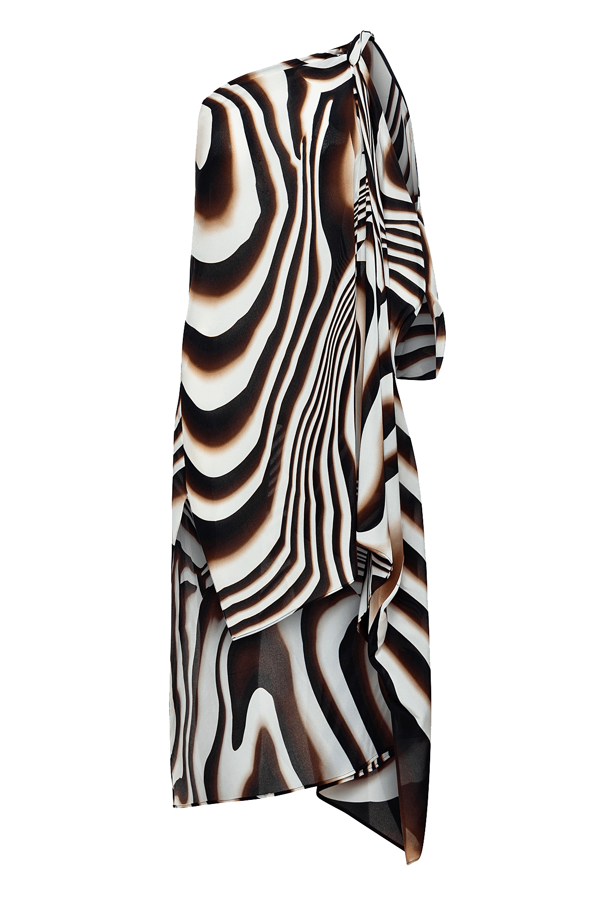 The iconic Kallas dress makes a return with a twist! Cut in silk crepe de chine, it features asymmetric hemming and a twisted knot detail on the shoulder.